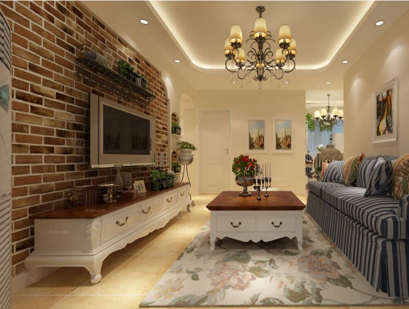 田园风格的自然气息非常浓厚,极其贴近自然、追求生活的朴实。因而色调不求明艳与华丽,多以清新和自然的浅色系为主要,使用得比较多的有白色、米黄色、板岩色、淡绿色、粉色等等,多会选用淡雅清新的颜色,以此来给人营造一种心旷神怡、置身自然的返璞归真之感。此外碎花效果的家纺,也是田园风的重点元素之一,十分亲近田园风格。另外,对电视墙也不会做分色处理。